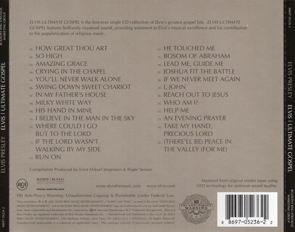 "ELVIS ULTIMATE GOSPEL is the first-ever single CD collection of Elvis's greatest gospel hits. ELVIS ULTIMATE GOSPEL features brilliantly mastered sound, providing testament to Elvis's musical excellence and his contribution to the popularization of religious music."